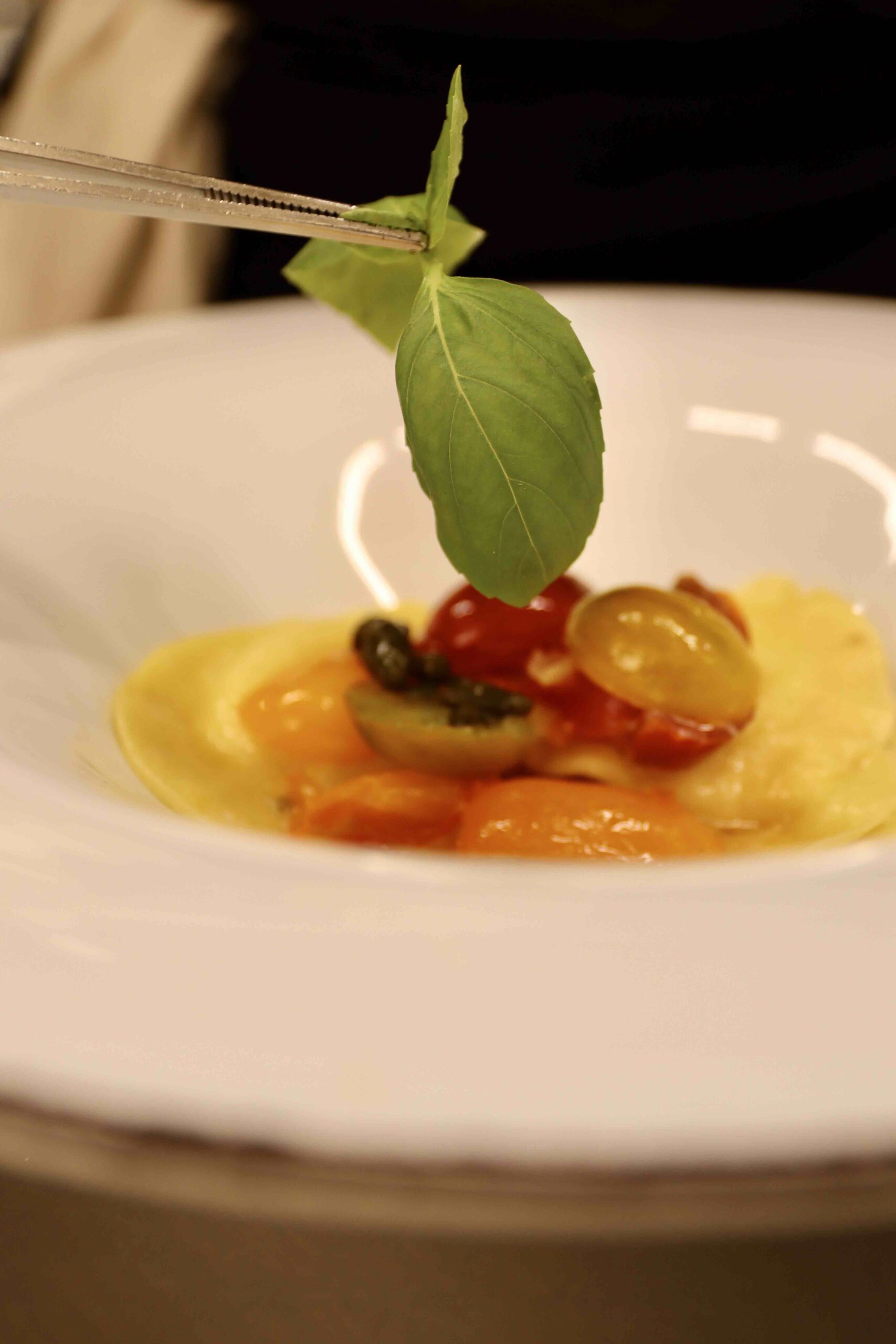 Tortelli ripieni di cacio e pepe, ridotto di pere, caviale di aceto balsamico e chips di pere