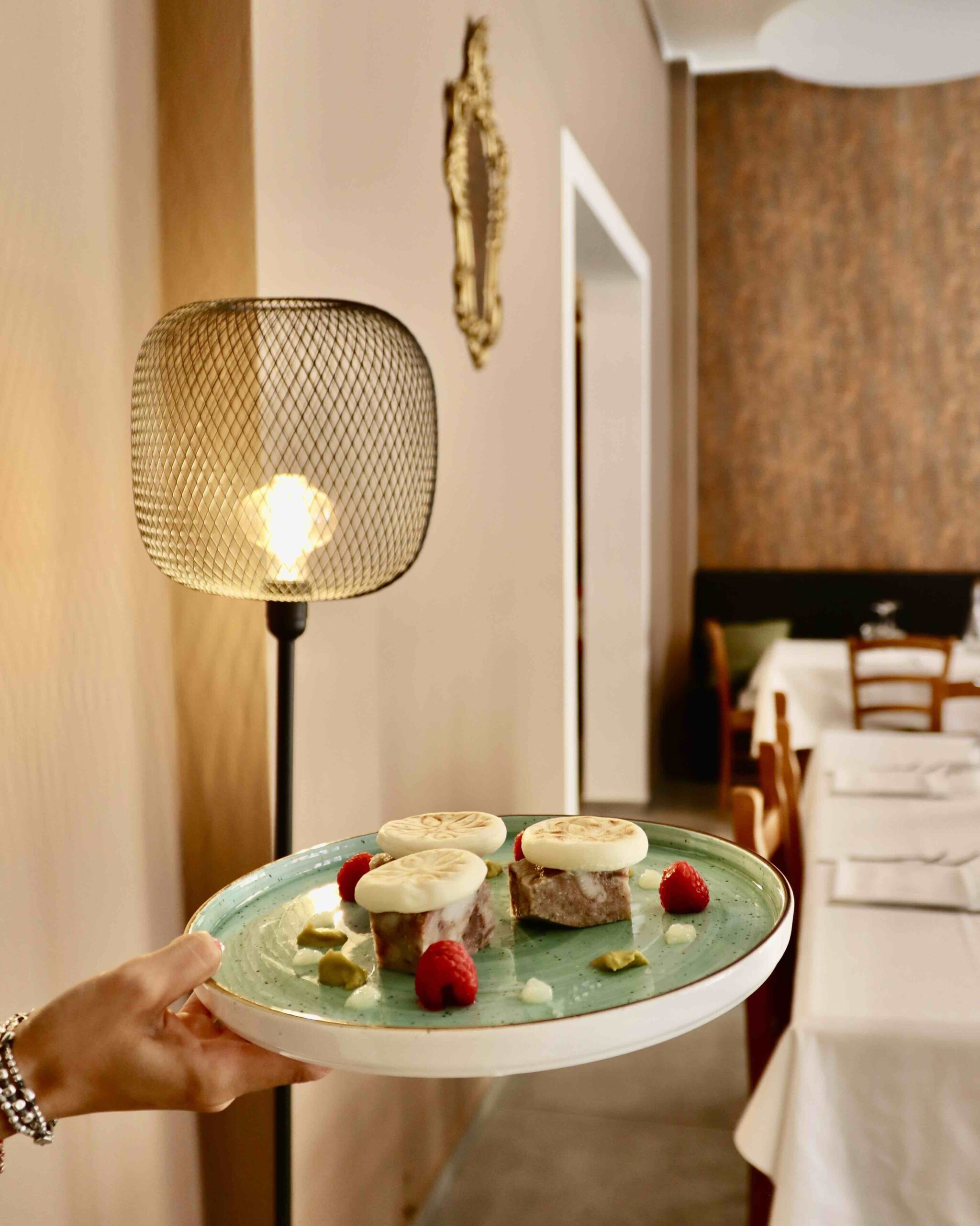 Battuta di manzo al coltello, mousse soffice di ricotta al lime e scalogno, cialda di pane al rosmarino e pomodorini secchi